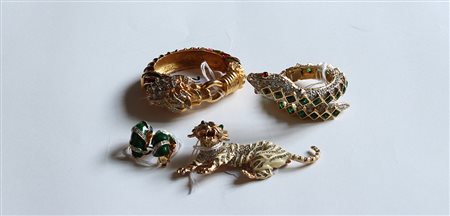 Lotto composto da una spilla a forma di tigre, un bracciale rigido con testa di leone, un bracciale semi-rigido a forma di serpente e un paio di orecchini a lobo, tutto in metallo color oro, rifiniti con strass, pietre fancy verdi e rosse, smalti di vari colori