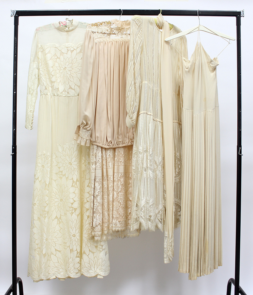 Lotto di tre abiti di cui due lunghi e l‘ altro longuette più un completo camicia e gonna, tutti nei toni dell’avorio (tg. Differenti) (difetti)