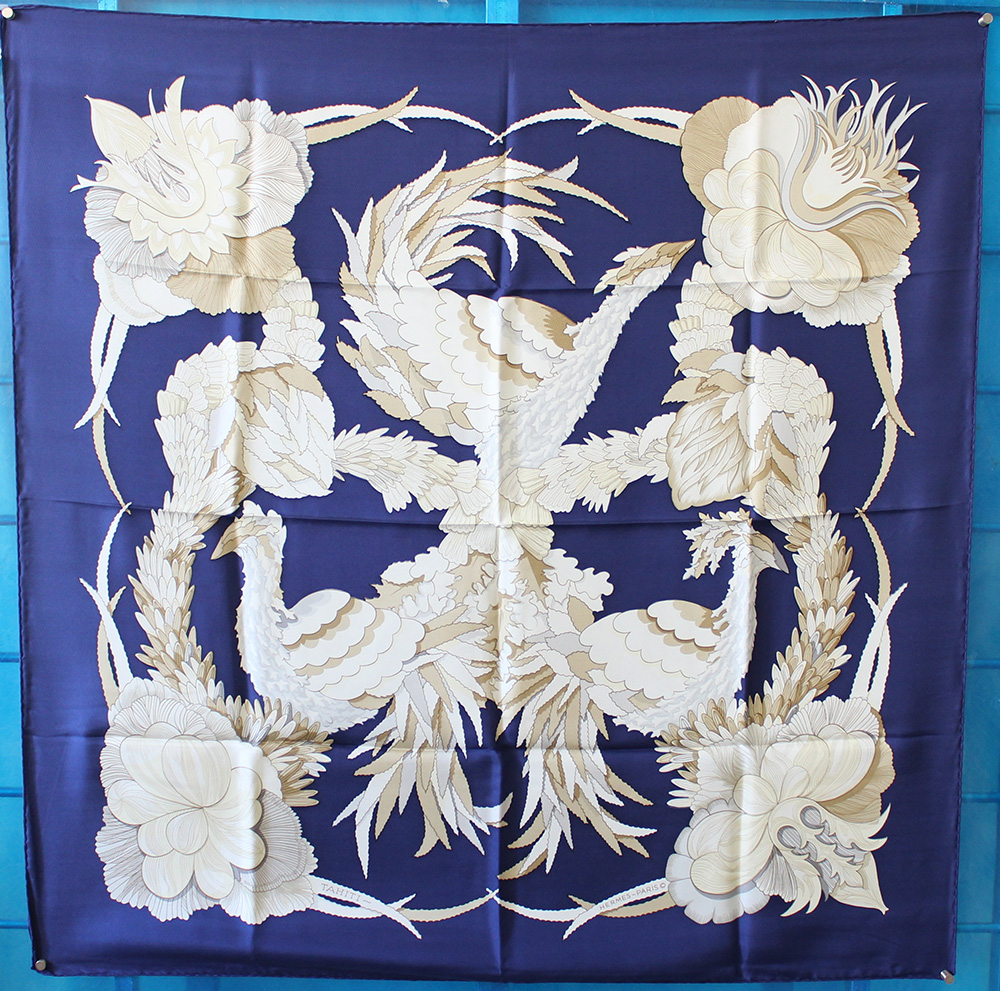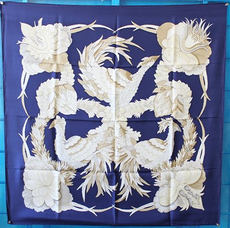 HERMÈS Foulard in seta "Tahiti", Caty Latham 1971, fondo blu, fantasia beige...