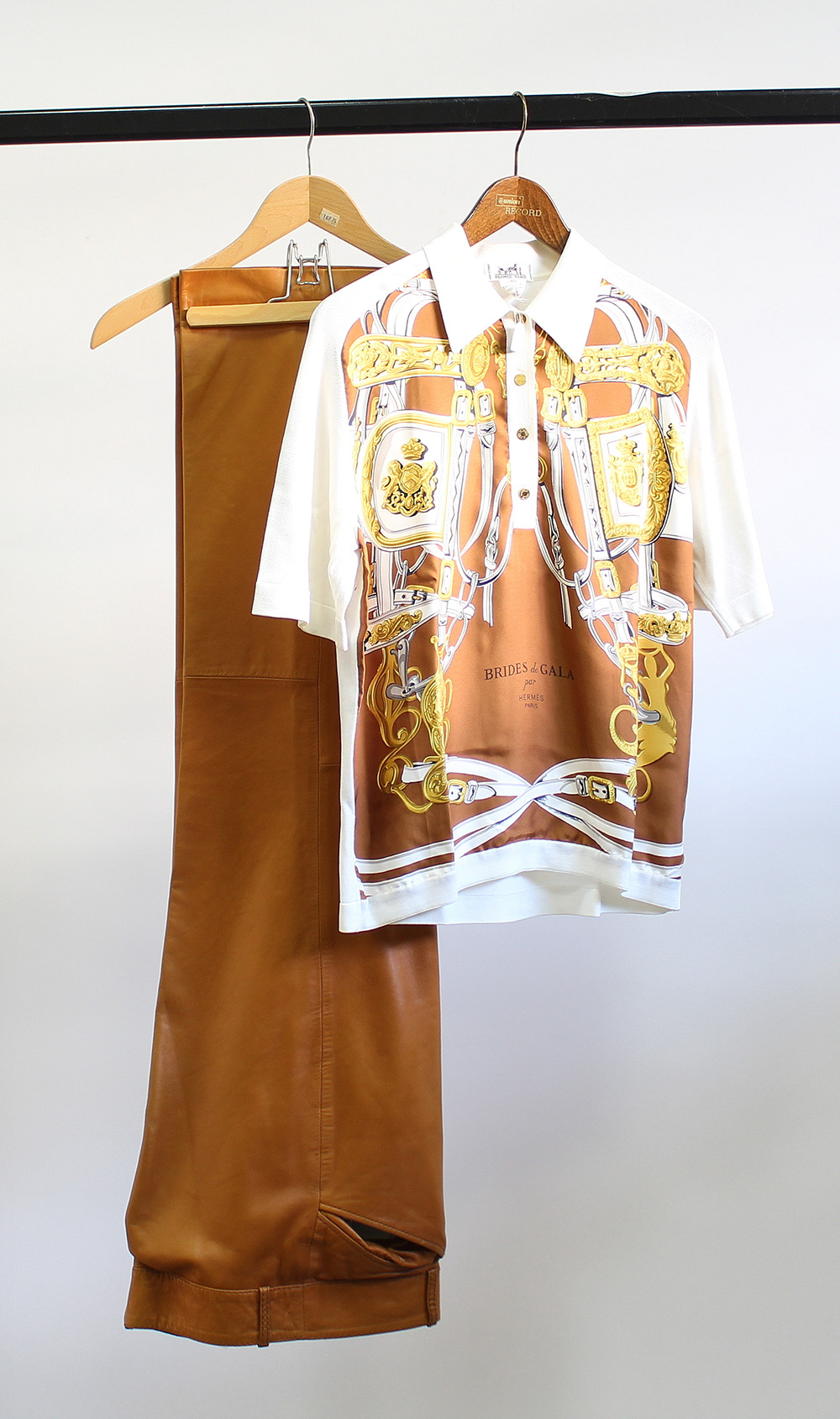 Lotto composto da maglietta in maglina di cotone e seta con disegno "Brides de Gala" e pantalone in pelle (tg. taglie miste) (lievi difetti)