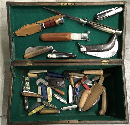 Scatola di legno contenenteuna serie di coltelli a scatto, piccoli coltelli da caccia, coltellini pubblicitari e una collezione di roncole di taglie varie. Metà secolo XX (difetti)