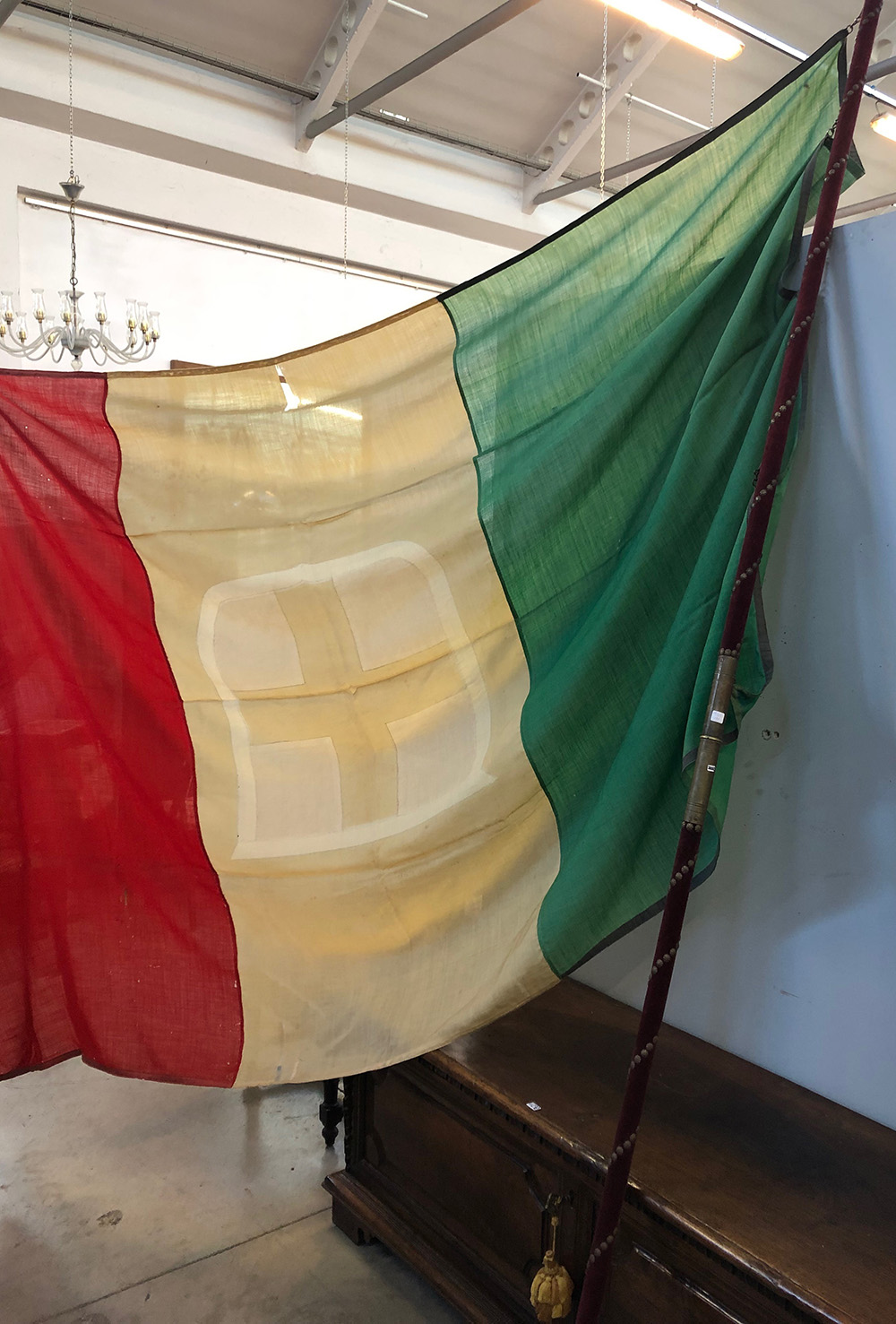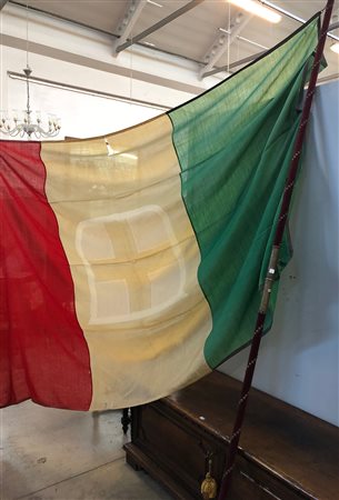 Grande bandiera italiana in lana montata su asta divisibile borchiata in velluto bordeaux. Bandiera smostreggiata dallo scudo sabaudo al centro (probabilmente per essere riutilizzzato in ambito repubblicano). In custodia in tessuto
