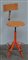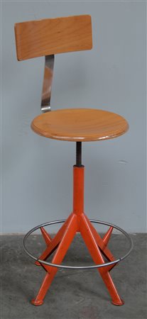 Sgabello girevole con seduta e schienale in legno, struttura in metallo arancione (difetti)