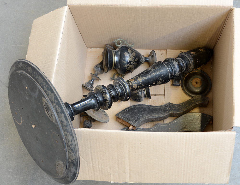 Cartone contenente un tavolino da fumo in legno ebanizzato e argentato. Secolo XIX (difetti e mancanze)