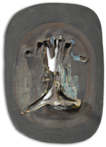 LUCIO FONTANA 1899 - 1968 CONCETTO SPAZIALE signed, painted and glazed terracotta. Executed in 1955-60 firmato squarcio su terracotta colorata e riflessata cm 38x28,5x4 Eseguito nel 1955-1960 Opera registrata presso la Fondazione Lucio Fontana, Milano con il n. 523/132 L'opera è accompagnata da certificato su fotografia rilasciato dalla Fondazione Lucio Fontana, Milano