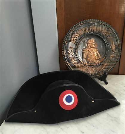 Lotto composto da una feluca di Carnevale e un piatto sbalzato con effige dell'imperatore. (d. cm 30) (difetti)