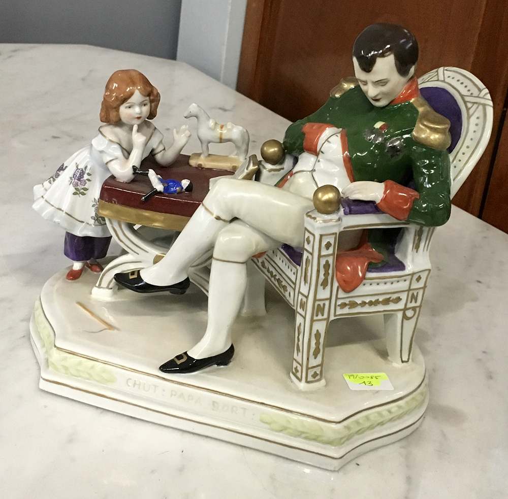 Gruppo in porcellana policroma di manifattura tedesco Nürendorf raffigurante Napoleone assiso insieme al figlio.