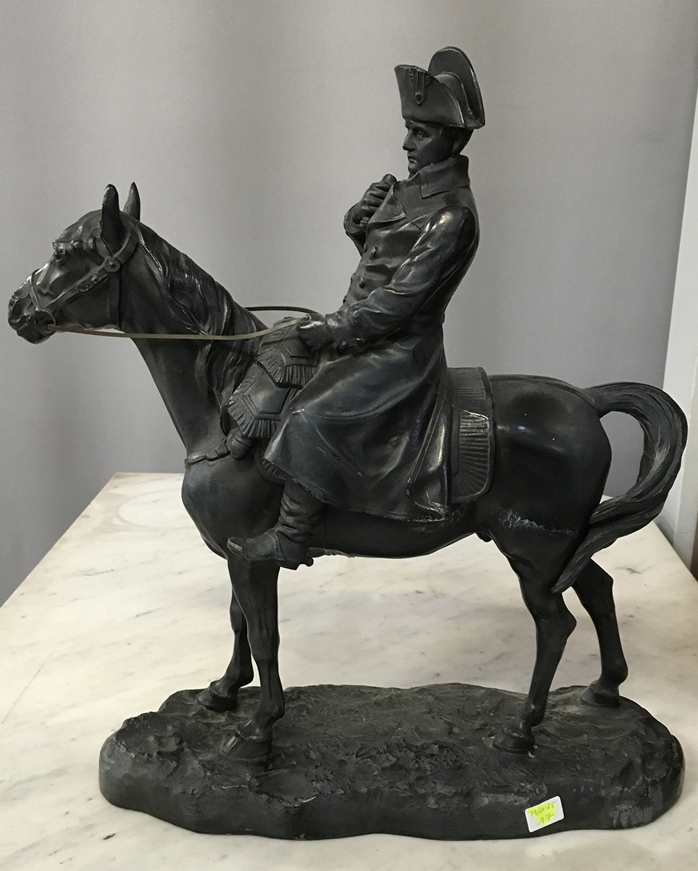 Statua equestre in bronzo raffigurante Napoleone a cavallo in redingote