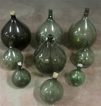 Lotto di nove damigiane in vetro di differenti capienze prive di rivestimento (difetti)