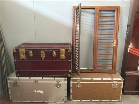 Lotto composto da una finestra in legno per dispensa a muro (cm 89x131x4,5) e tre bauli di differente fattura (lievi difetti)
