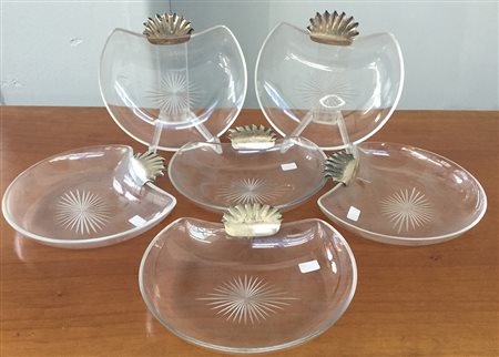 Manifattura di Lalique, gruppo di sei antipastiere in cristallo a mezzaluna...