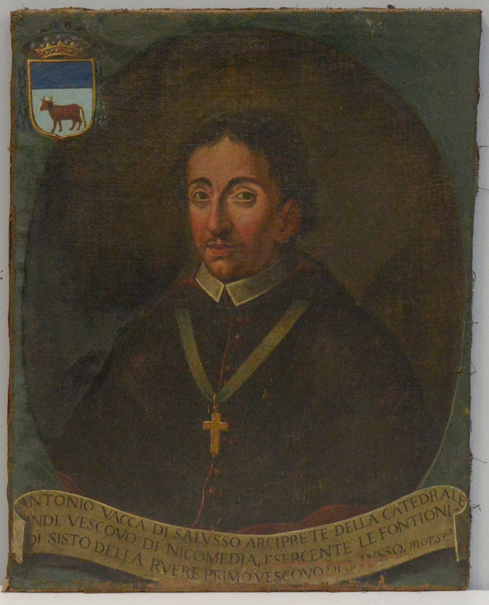 Scuola del secolo XVII "Ritratto di Antonio Vacca di Saluzzo" olio su tela (cm 75x60). Iscritto nel cartiglio in basso (difetti, mancanze e restauri)