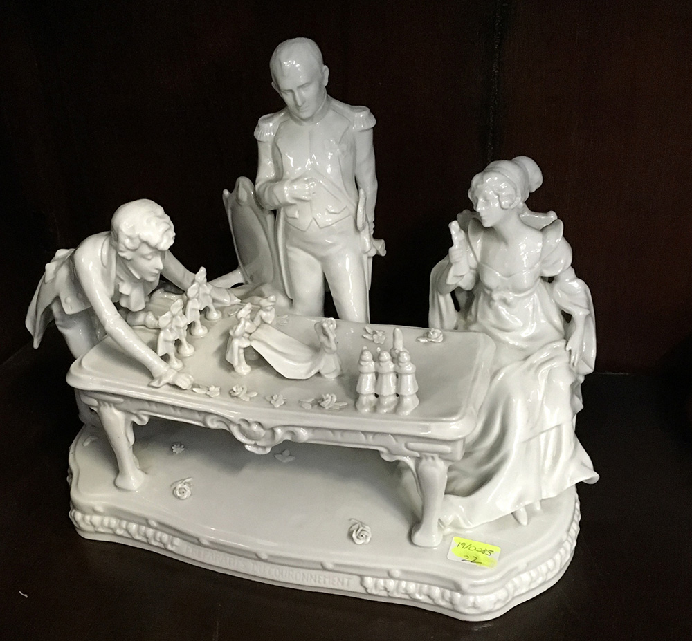 Gruppo in porcellana bianca invetriata raffigurante Napoleone, l'imperatrice ed un terzo personaggio attorno ad un tavolo sul quale sono raffigurati personaggi dell'incoronazione.