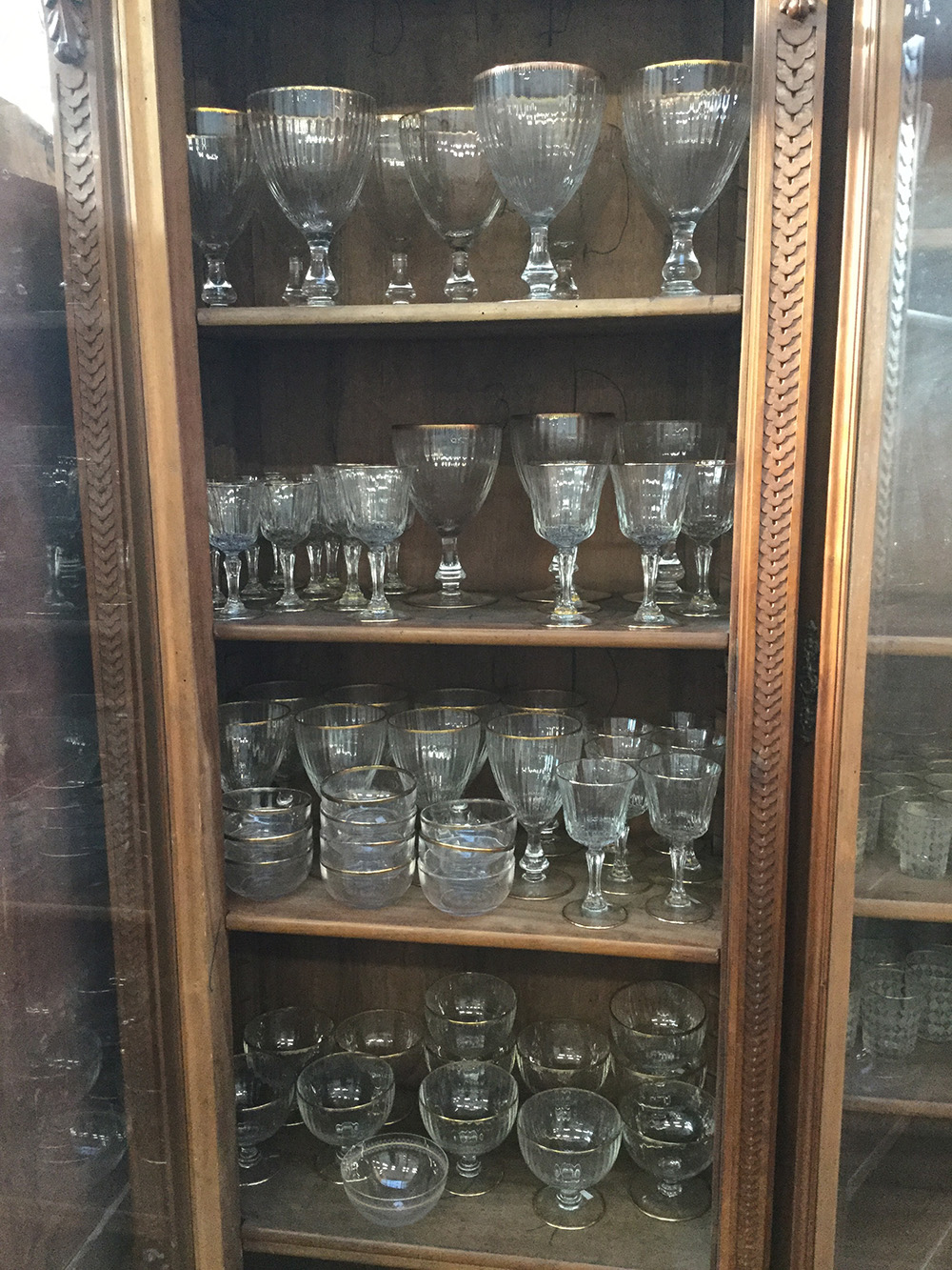 Servizio di bicchieri e da macedonia in cristallo costolato con profili dorati, composto da venti coppe grandi di differenti altezze, dodici bicchieri per acqua e sette da vino, dodici coppe per macedonia. Si uniscono undici coppette di differente manifattura (difetti)