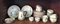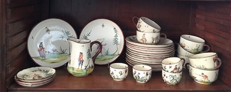 Parte di servizio da tè e caffè dipinto con figure e paesaggi su ceramiche di Laveno, composto da quattordici piatti da dolce, sette tazze con dieci piattini, quattro tazzine con tre piattini e una lattiera (difetti e mancanze)
