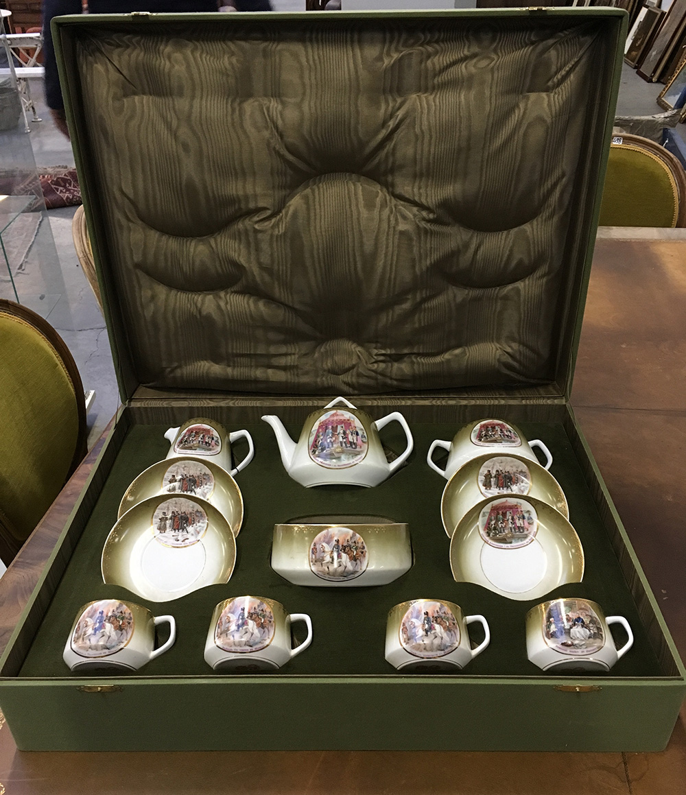 Importante servizio da the composto da 4 tazzine, 4 piattini, una biscottiera, una lattiera, una zuccheriera ed una teiera decorati con scene napoleoniche e russe contenute in astuccio.