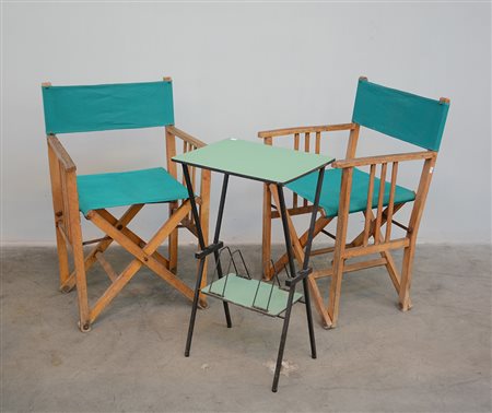 Due sedie pieghevoli in legno e tessuto e un tavolino