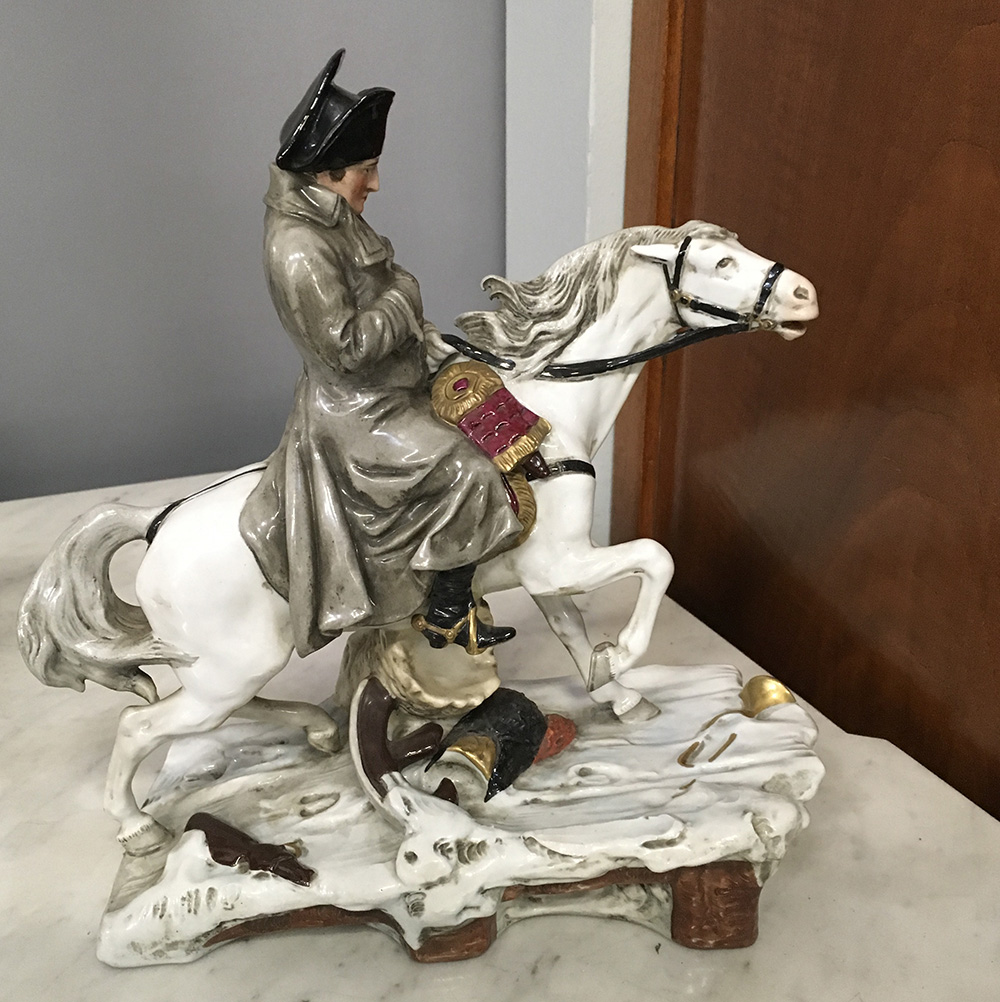 Gruppo in porcellana policroma raffigurante Napoleone a cavallo sulla neve della Russia in buono stato di conservazione.
