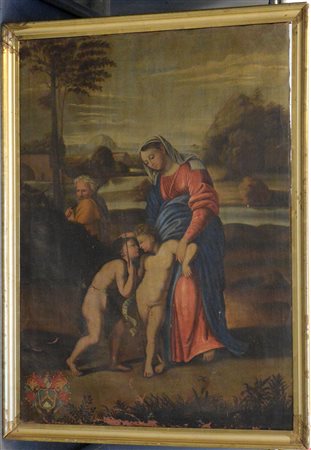 Ignoto della fine del secolo XIX "Sacra Famiglia con San Giovannino in un paesaggio" olio su tela (cm 100x72). In cornice (difetti e restauri)