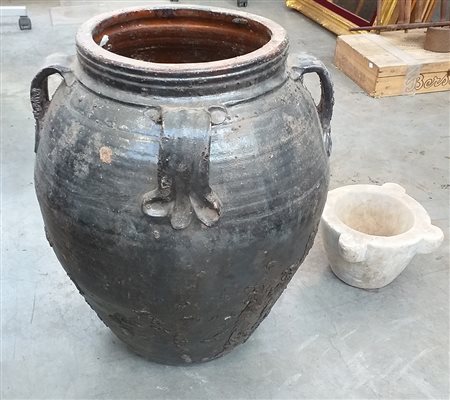Lotto composto da un mortaio in marmo e una giara in terracotta smaltata...