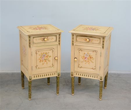 Coppia di comodini in legno laccato ad un'anta e un cassetto (cm 40,5x74,5x36,5)