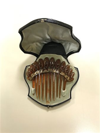 "Peinete" in celluloide color tartaruga con motivo di segni zodiacali e cifre "CC" in metallo a rilievo, in custodia originale (rotture)