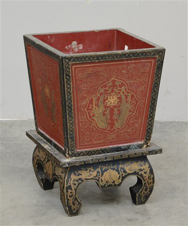 Fioriera in legno laccato con decori naturalistici. Cina, secolo XX (cm 37x56x37) (difetti)