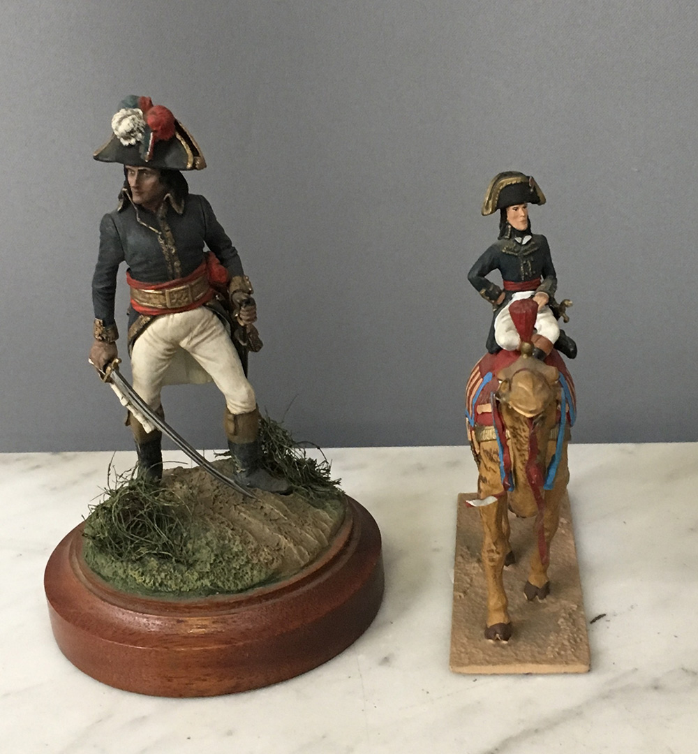 Lotto di due figurini d'artista in piombo, uno rappresentante Napoleone Bonaparte durante la campagna d'Italia, l'altro raffigurante Napoleone in Egitto su dromedario.