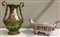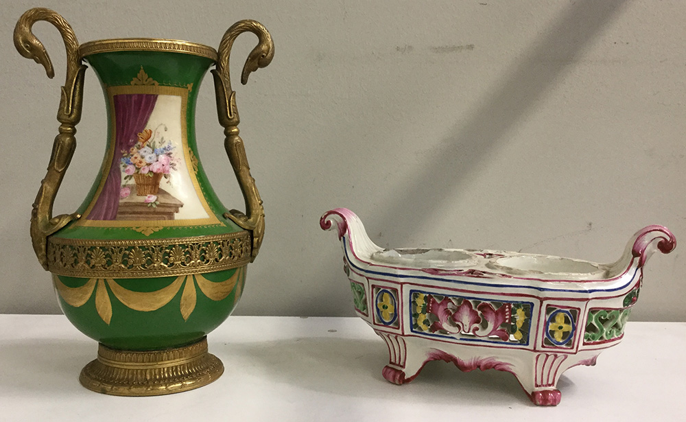 Lotto composto da vaso biansato in porcellana dipinta con guarnizioni in bronzo e un calamaio in ceramica (difetti)