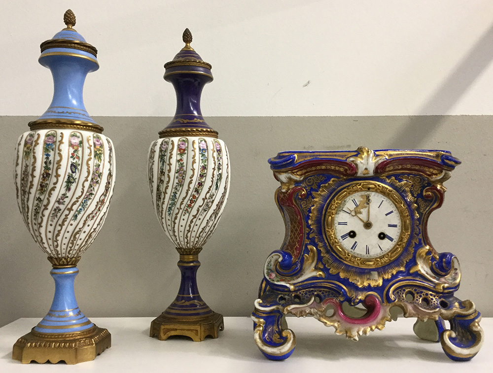 Lotto composto da una pendola e due vasi decorativi in ceramica policroma a decori floreali (h max 41) (difetti e restauri)