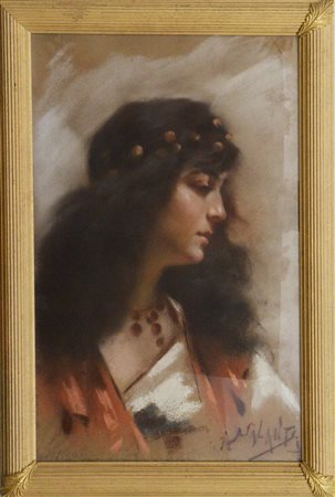 "Ritratto di gitana" pastello su carta (cm 75x46) Firmato in basso a destra. In cornice (difetti)