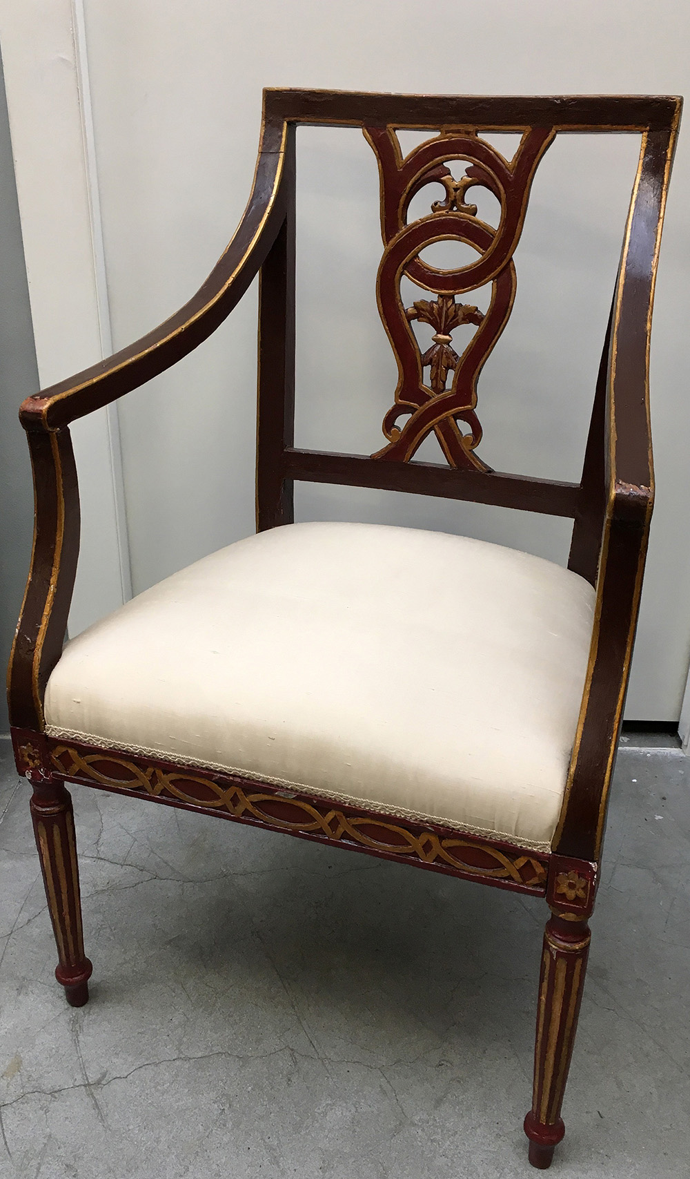 Poltrona in legno dipinto e dorato con schienale traforato a motivo concatenato (difetti e restauri)
