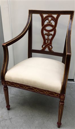Poltrona in legno dipinto e dorato con schienale traforato a motivo...