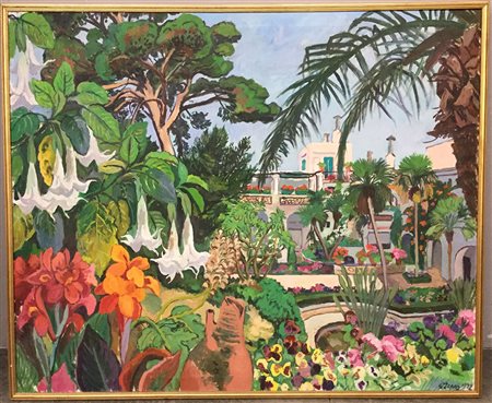 "Capri" olio su tela (cm 90x110) firmato in basso a destra, titolato, firmato e datato 1972 al verso, in cornice (difetti)