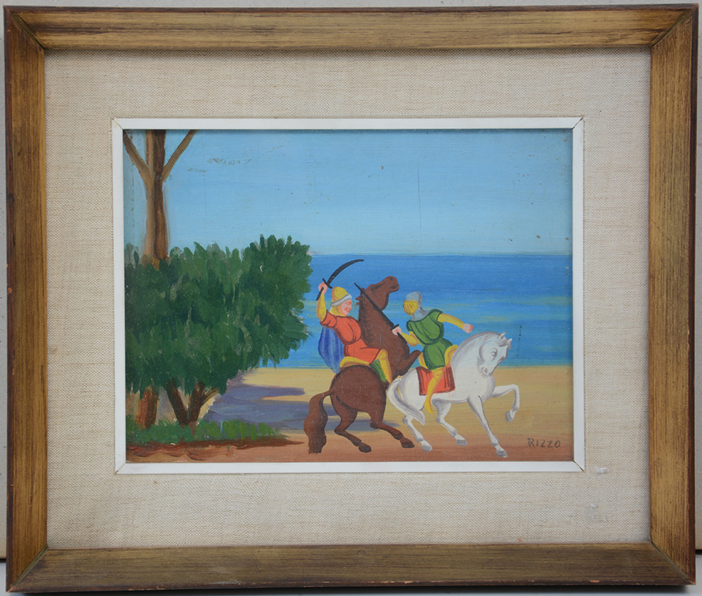 Pippo Rizzo (1898 - 1964)"Battaglia di paladini" olio e tempera su tavoletta,...