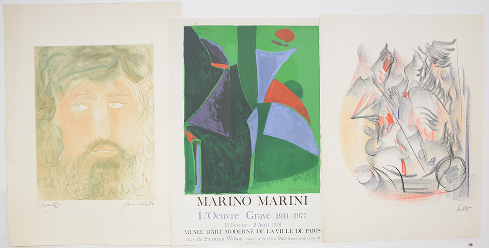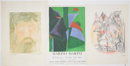 Lotto composto da un'acquaforte di Manzù, un poster litografico di una mostra di Marino Marini e un disegno a pastelli, misure diverse