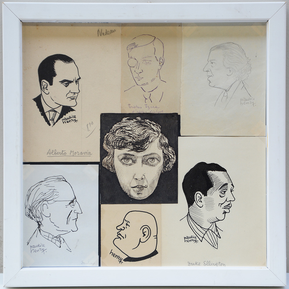 Lotto composto da sette piccoli ritratti montati in un unica cornice raffiguranti personaggi tra cui Alberto Moravia, Tristan Tzara e Duke Elllington