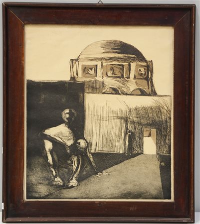 Ignoto "Senza titolo" acquaforte (lastra cm 44,5x38) firmata e datata 5-5-63 in basso a destra, in cornice (difetti)