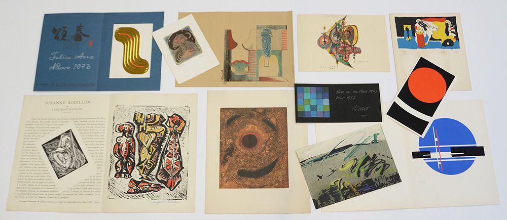 Lotto composto da numerosi biglietti augurali con piccole litografie e qualche disegno di artisti tra cui Bruno Chersicla, Antonio Franchini, Shu Takahashi e Alexander Liberman