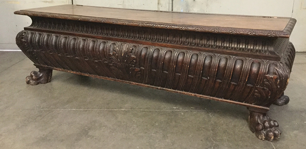 Cassone neorinascimentale in legno intagliato con fascia baccellata e zampe ferine (cm 166x51x50) (difetti)