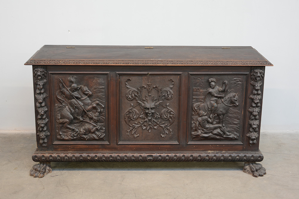 Cassapanca in legno scolpito con fronte decorata a tre riquadri raffiguranti S. Giorgio, S. Martino e un mascherone centrale (cm 133x73x45,5)