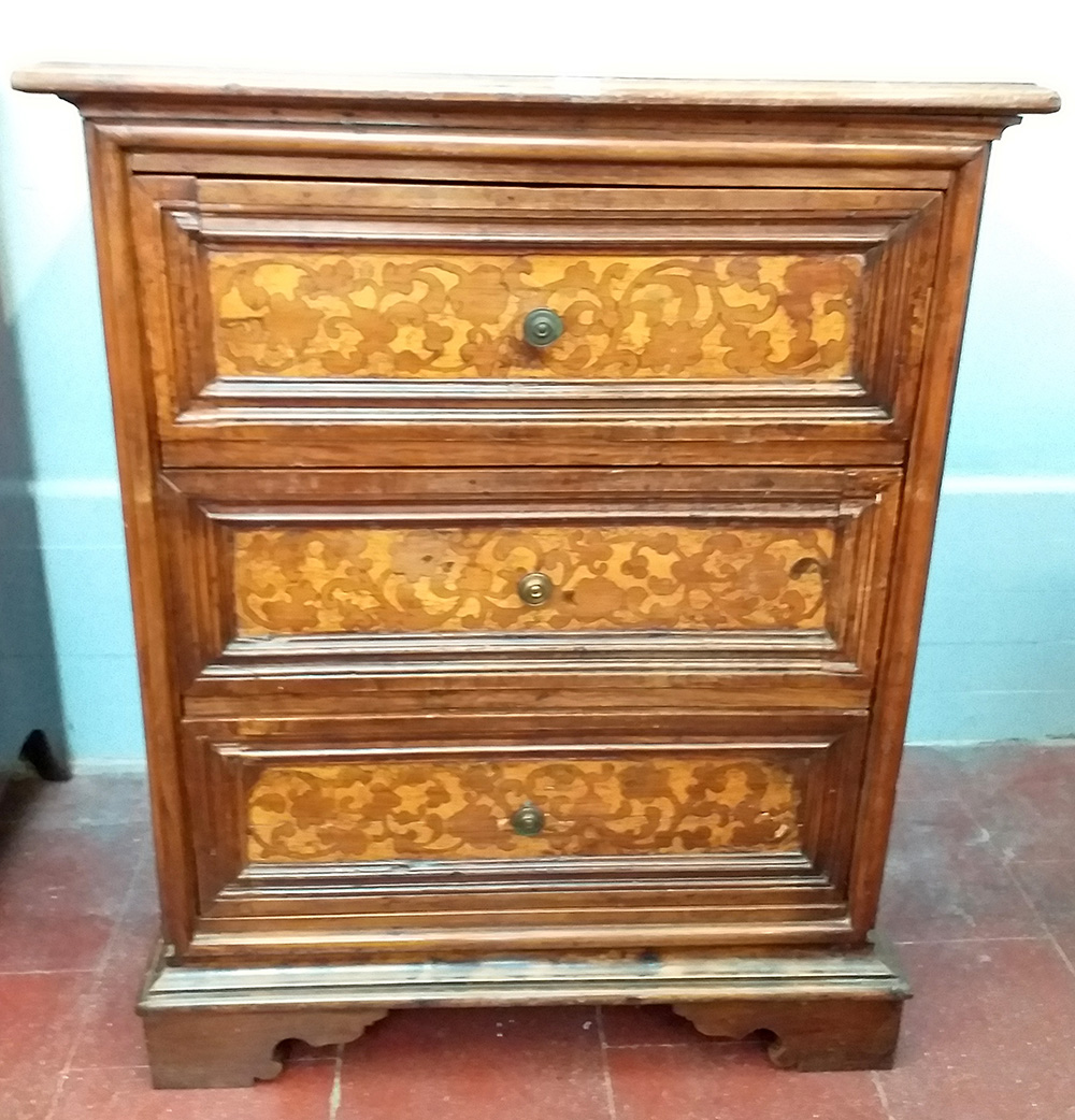 Coppia di comoncini in legno a tre cassetti intarsiati sul fronte (cm 72x90x54) (difetti)
