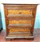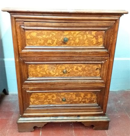 Coppia di comoncini in legno a tre cassetti intarsiati sul fronte (cm...