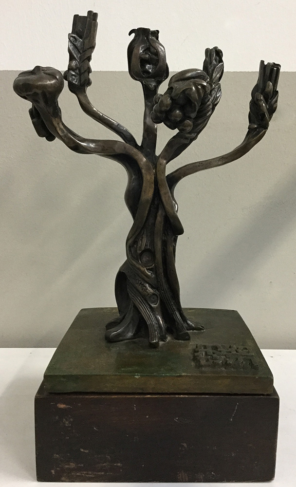 "Seven Species Menorah", scultura in bronzo con basamento in legno (h tot 34) firmato sul fusto e alla base