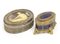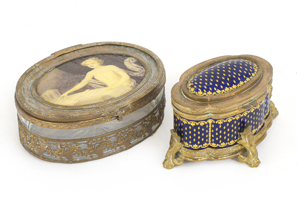 Lotto composto da due scatole in metallo dorato, una decorata a smalti, l'altra con ritratto e allegoria dell'architettura (difetti)