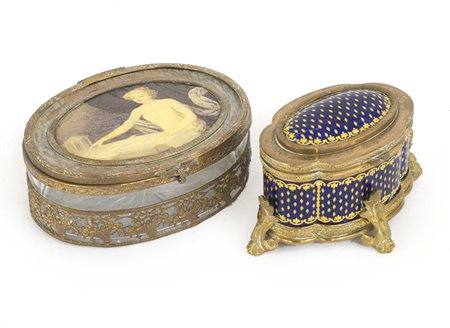Lotto composto da due scatole in metallo dorato, una decorata a smalti,...