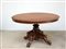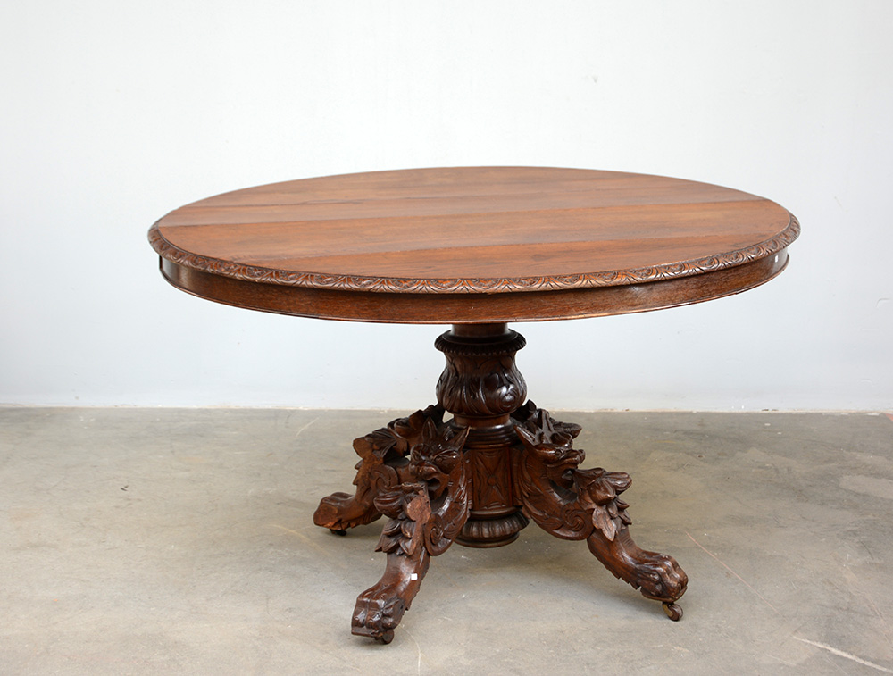 Tavolo tondo con sostegno a colonna su quattro gambe in legno intagliato a teste e zampe belluine munite di rotelle(h cm 74, d cm 112) (difetti e mancanze)