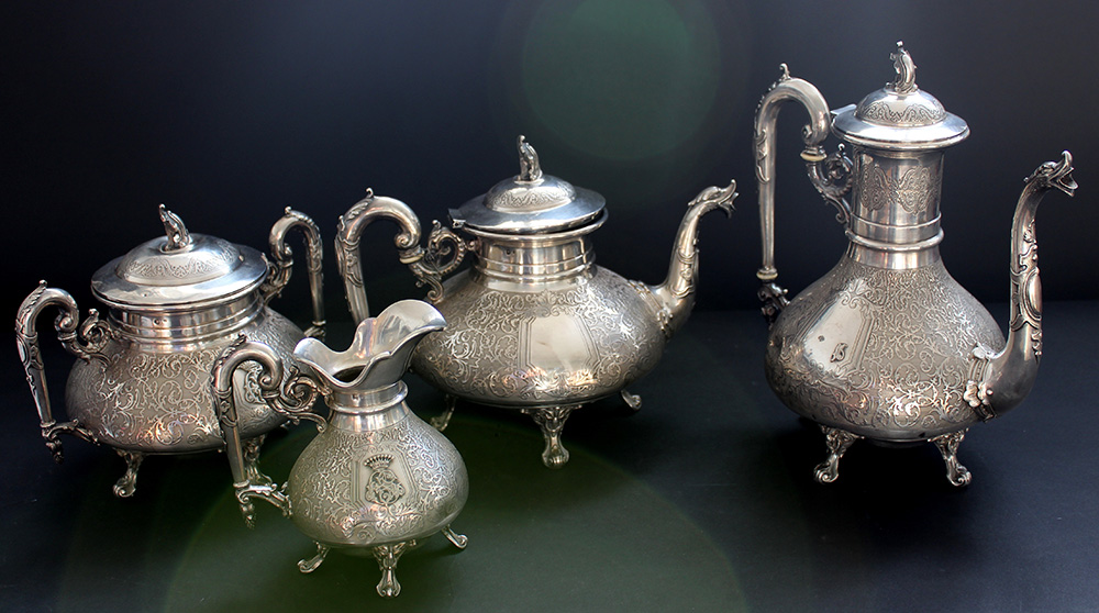 Servizio da tè e caffè composto da teiera, caffettiera, zuccheriera con coperchio e lattiera in argento finemente cesellato a motivi vegetali. Beccucci a forma di animale fantastico e prese del coperchio a forma di stemma. Piedini sagomati cesellatti all'attacco a testa leonina. Argentiere Flamans & Fils (g 1841 ca.) (difetti)