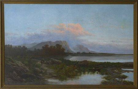 Firma indecifrata "Paesaggio lacustre" 1895 olio su tela (cm 105x164) firmato, datato e locato Roma in basso a sinistra, in cornice (difetti)
