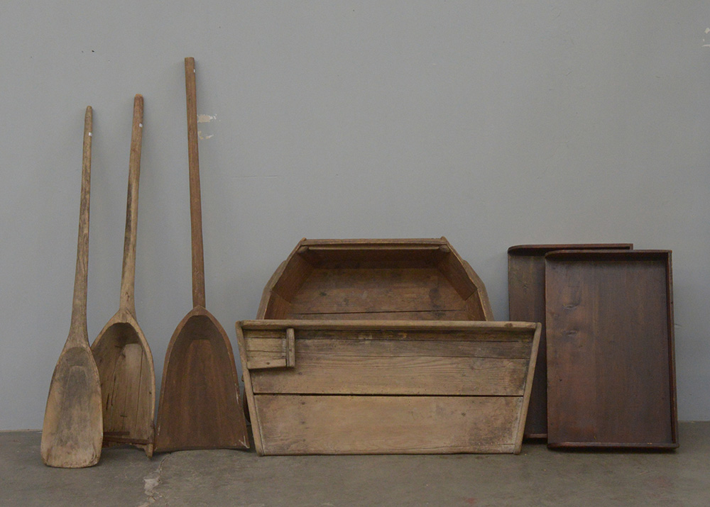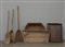 Lotto composto da tre pale in legno, asse da bucato e tre contenitori rustici...